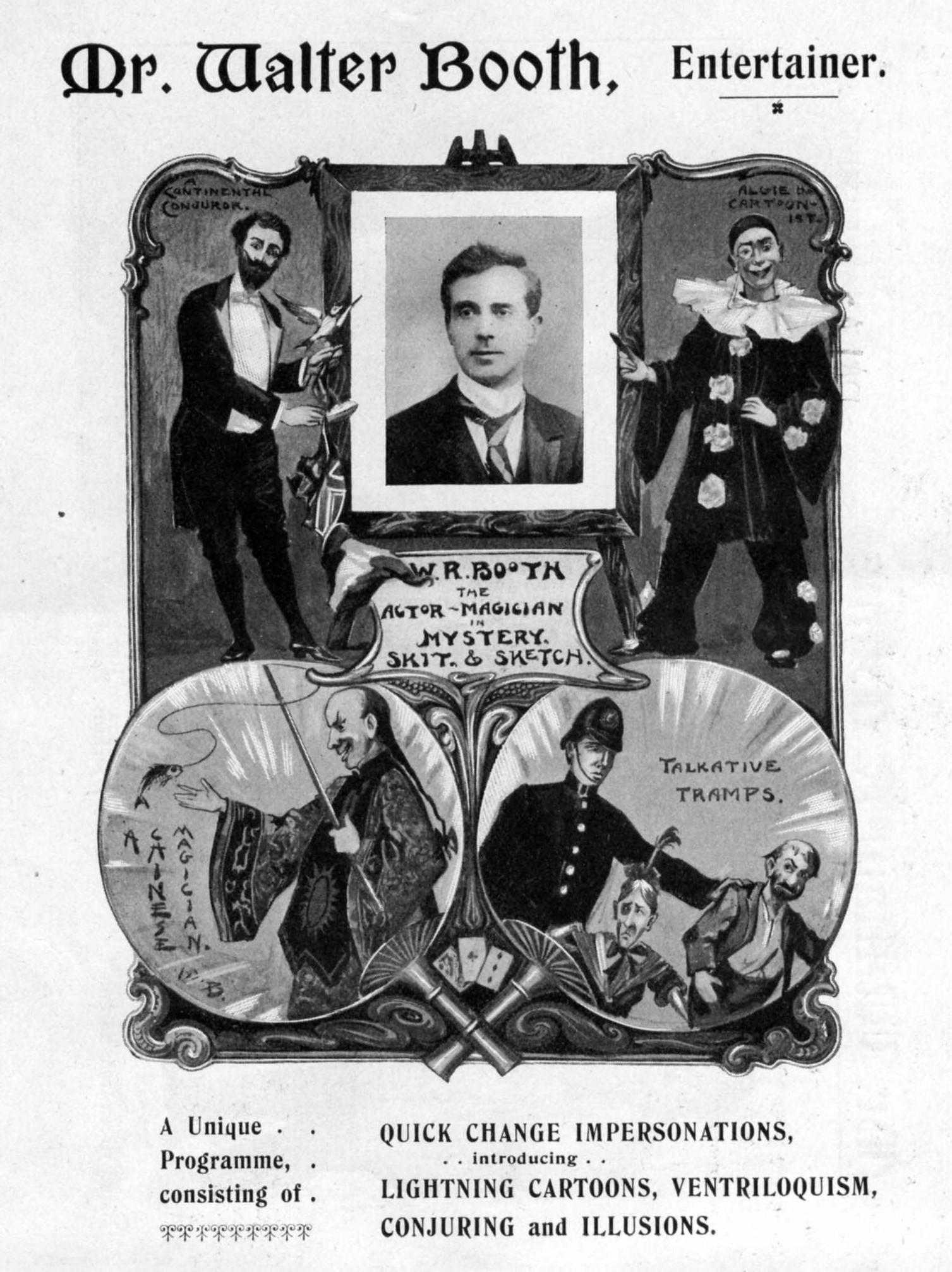 Born on 12th July 1869, in Worcester, England, Booth’s fascination with illusion and mystery began at an early age. Inspired by the mesmerizing acts of traveling magicians, he embarked on a journey to master the art of sleight of hand, misdirection, and stagecraft. His unwavering dedication led him to become a respected magician, captivating audiences with his spellbinding performances that combined traditional magic with imaginative innovations.